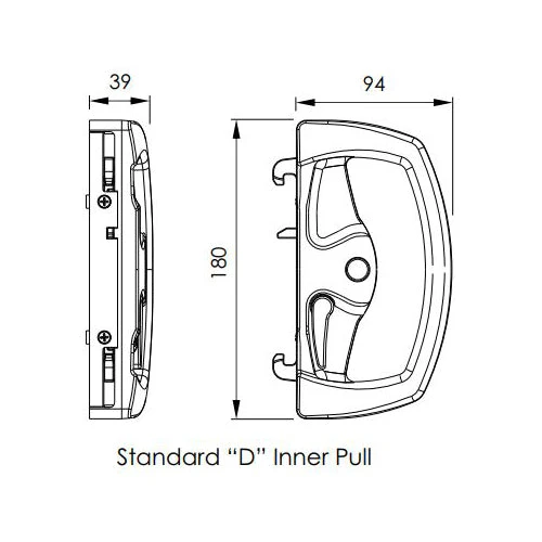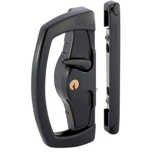 Reliable all-metal lock for aluminium sliding doors. Once the door is closed, the twin beaks are operated by key or lever to engage the catch plate.