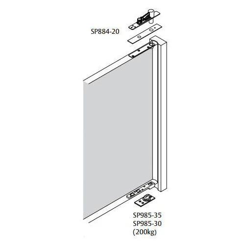 Suitable for door applications where a free swing pivot door is required. Consists of retractable top pivot set with heavy duty bottom pivot and strap. Suitable for aluminium, timber and glass doors.