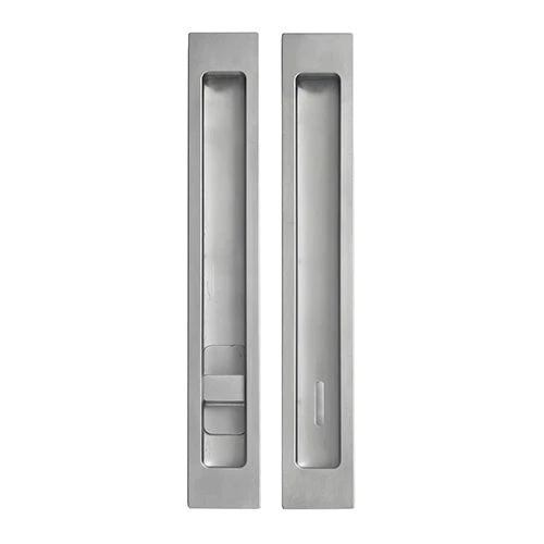 The Halliday+Baillie HB695 sliding door privacy set features an integrated push button-activated edge pull for pocketed doors. The operable snib slides upwards to engage the lock. The discrete emergency release can be operated with a pen or other sharp object to disengage the lock from the exterior.