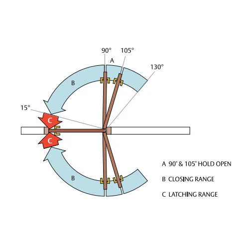 - Door Control – Two independent adjustment valves provide full hydraulic control from 130Ëš to 15Ëš of closing and 15Ëš to 0Ëš of latching.